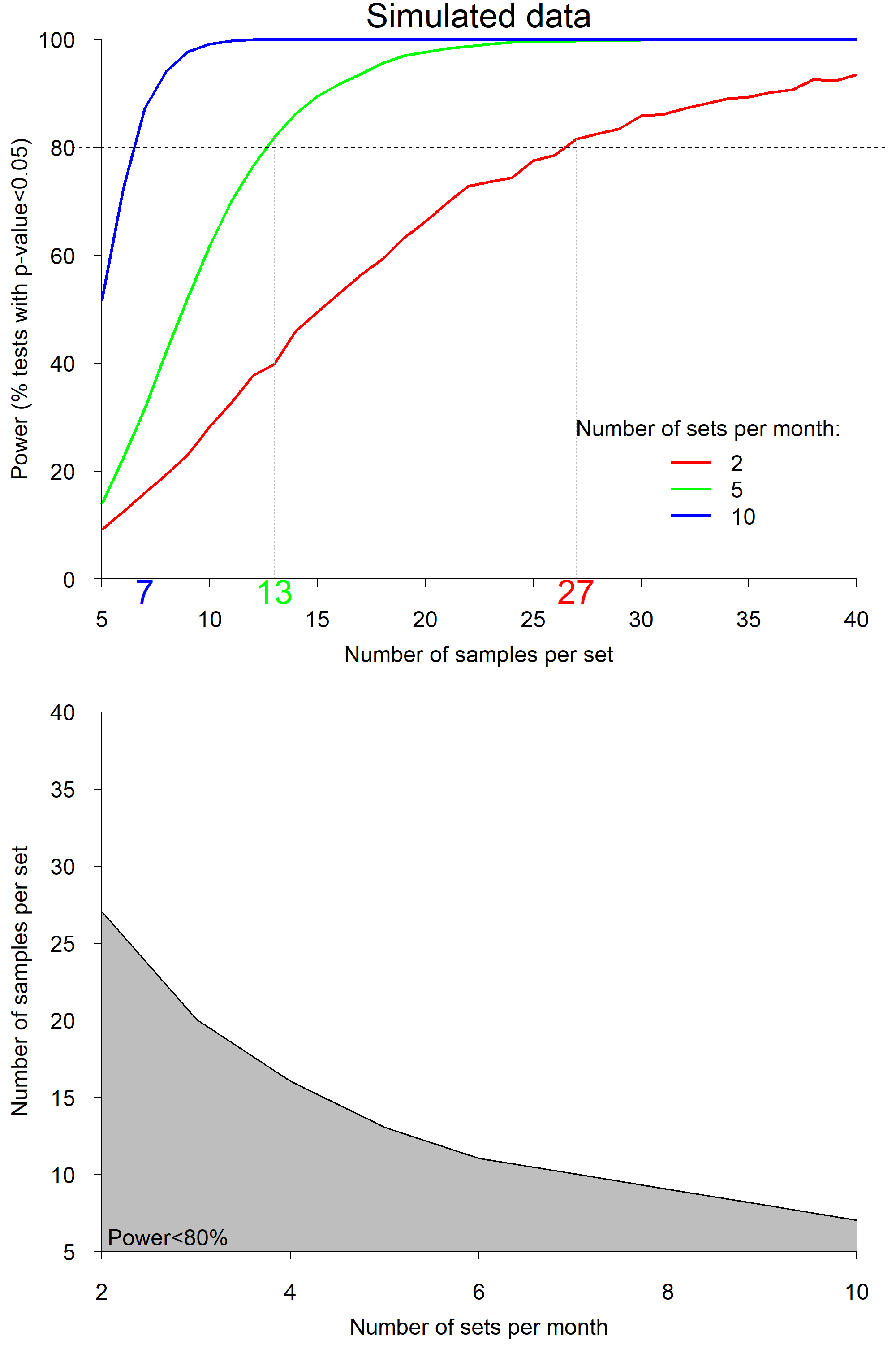 Figure 1. Results of the power analysis using simulated data. Top: Power as a function of number of samples per longline set, for 3 different numbers of sets per month (red: 2 sets; green: 5 sets; blue: 10 sets). The horizontal dashed line indicates the target power of 80% and coloured numbers on the x-axis indicate the required numbers of samples per set to reach that target power. Bottom: 80% isoline of power as a function of the number of samples per set and the number of sets per month. The grey area indicates the zone of insufficient power.
